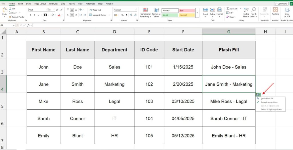 1. Type the full result you want in the first cell (e.g., manually type “John Doe – Sales”).