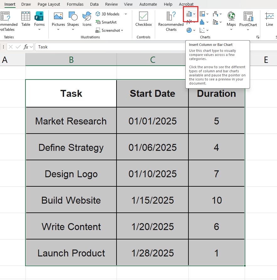 - Go to Insert > Insert Column or Bar Chart.